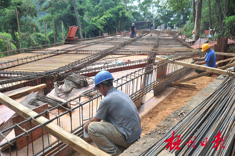 ??? 8月5日,在白云山公園上,工人正在綁扎路橋橋面的鋼筋。