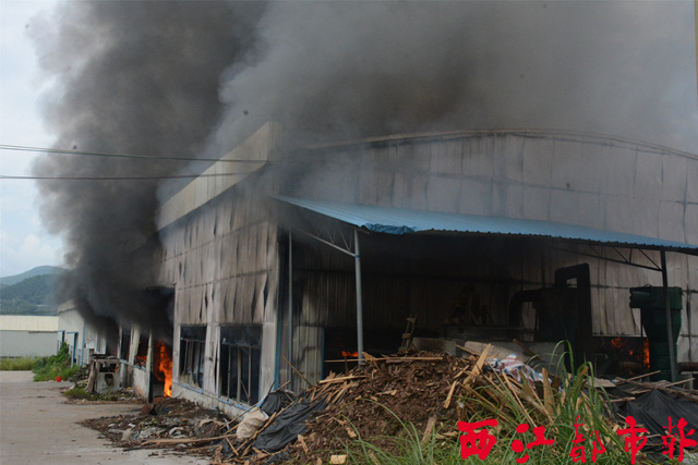 ????14時02分,消防官兵趕至現場,只見該廠房正在熊熊燃燒,廠房四周的窗戶不時有火苗竄出。因火勢猛烈,岑溪市消防大隊立即設立四個水槍陣地控制工廠火勢,并向梧州消防支隊請求增援。