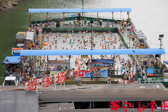 眾多市民到梧州市水上游泳場游泳消暑。趙洋/攝