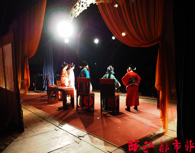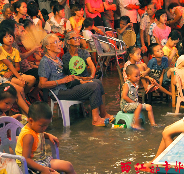 ????8月2日晚的演出,演員們不但要經歷“熱”的煎熬,還經受了“水”的洗禮。當晚,剛開演不久,天上驟然下起大雨。一時間,舞臺上的頂棚四處漏水,棚外下大雨,棚內下小雨。此時,臺上的演員在雨中堅持表演,而臺下的觀眾也興致不減,即使兩只腳泡在水中仍然看得投入。