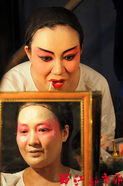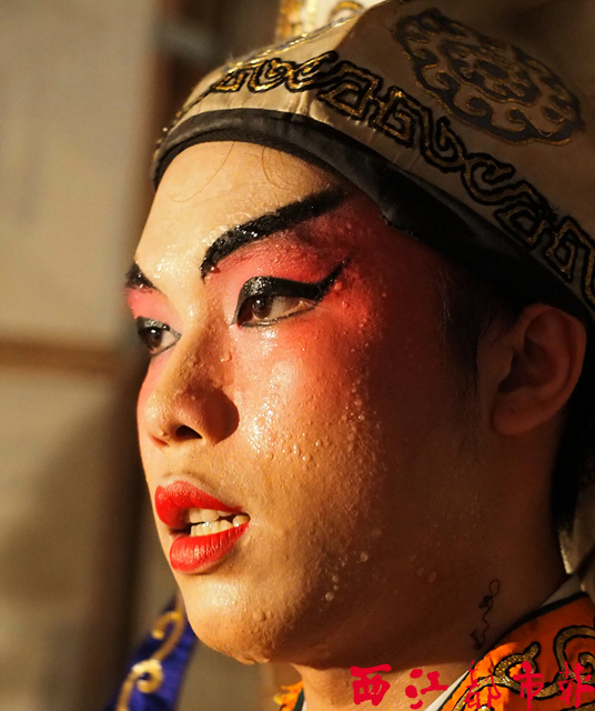 ????當天,戲棚內氣溫超過40℃。先別說穿上厚厚的戲服,人一站在棚內就直冒汗。演出前,演員在燈光下化妝,油彩還沒描上臉,臉上的汗水已把底妝沖花?!按鬅崽旎瘖y就像一邊上妝,一邊卸妝?!毖輪T們笑言,化一個戲妝,足足用了兩個多小時。