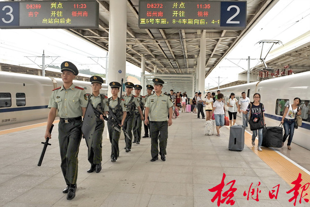 ????針對中秋節(jié)小長假外出車輛多、親朋聚會多、外出旅游多的實際,武警梧州市支隊派出官兵,加強對南廣鐵路梧州南站、梧州火車站等公共場所的巡邏,并延長執(zhí)勤時間,確保旅客、市民群眾節(jié)日安全。 孟亞西 李卓凡 攝