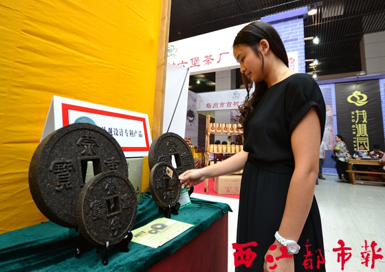 ?交易會(huì)上,銅錢(qián)造型的茶餅引起了市民的關(guān)注。