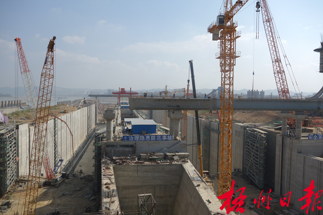 ????記者站在長洲水利樞紐三線四線船閘的交通橋上,船閘雛形盡收眼底——主體工程土建完成,集控樓矗立在江邊;上下引航道已經充水,一船疏浚船正在開挖水下圍堰;上下閘首分別高架起一座鋼梁;在兩座船閘的人字門旁,兩三臺吊車正在安裝人字門附件……