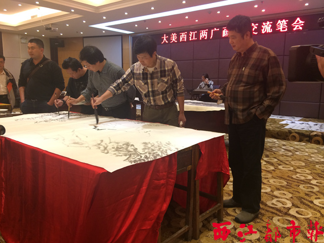 在兩廣畫家交流筆會上,“大美西江”兩廣畫家邀請展的九位參展畫家即席揮毫。