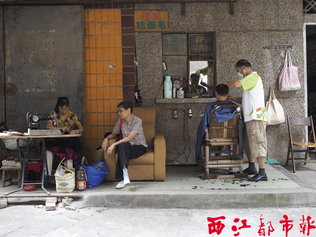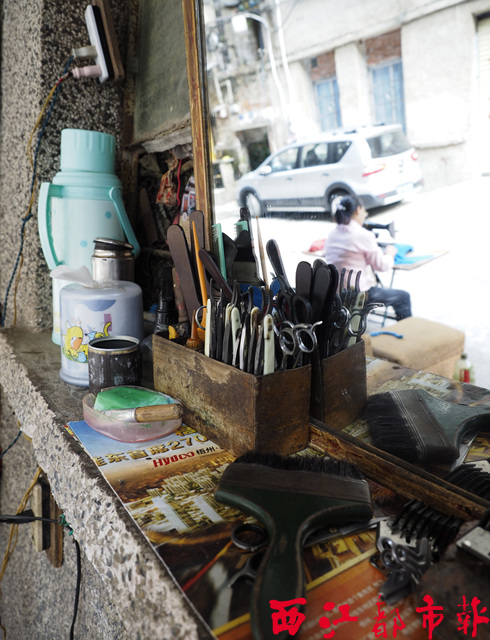 ????每天早上,陸師傅與妻子阿英姐從旁邊的宿舍樓把縫紉機(jī)抬到小攤位放好,再把鏡子和理發(fā)用具擺妥,就開始了一天的生計(jì)。
