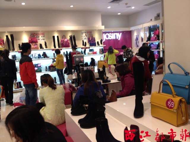 ????除了“購物狂歡節”的噱頭,連日來持續的低溫天氣,也為促銷加了一把勁。在太陽廣場一樓一家鞋店,店鋪門外貼著“新品冬靴全場4.8折”的廣告,而店內擠滿了前來選購靴子的市民。