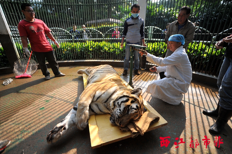 ????11月19日早上,梧州市動物園內的15歲東北虎“慶慶”,在籠舍里來回走動,惴惴不安。只因籠舍外,出現了許多陌生的面孔,而且每個人都似有備而來。原來,當天動物園的獸醫要給“慶慶”剪指甲。