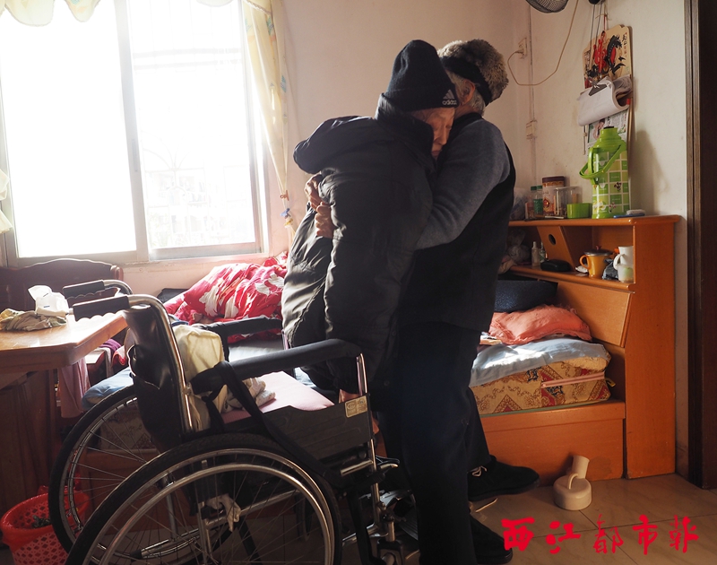 ????每次帶吳化斌外出,穆慶桂都仔細(xì)地幫他穿好衣褲,吃力地將他抱上輪椅,再推著他慢慢前行?!罢煞騽偘c瘓那幾年,家里還沒(méi)有輪椅,每次都是我抱著他或背著他外出的。”穆慶桂說(shuō)。