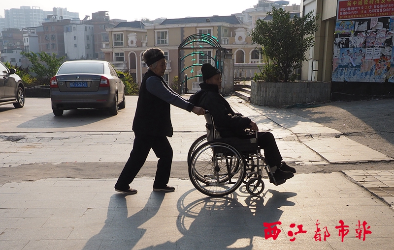 只要天氣好,穆慶桂就用輪椅推丈夫到戶外曬太陽(yáng)。