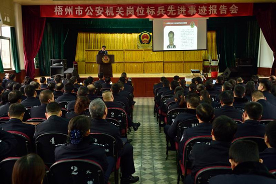梧州零距離網訊 為大力培育和踐行社會主義核心價值觀,充分展示全市公安機關開展黨的群眾路線教育實踐活動成果,弘揚我市廣大公安民警愛崗敬業(yè)、忠于職守、服務為民的精神,充分發(fā)揮先進典型的示范作用,引導全市公安民警從身邊人、手頭事做起,激發(fā)工作熱情,營造你追我趕創(chuàng)先爭優(yōu)的氛圍。12月25日下午,梧州市公安局在市局五樓禮堂舉辦了全市公安機關崗位標兵先進事跡報告會。市局各支隊、機關科室及3個城區(qū)分局等單位共240多人到會聆聽報告。