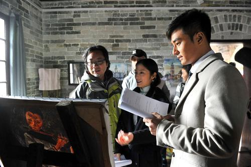 12月30日,電影《天各一方》導演云山(左一)在片場為男女主角鄭凱、潘辰講戲。本報記者 何鎏/攝