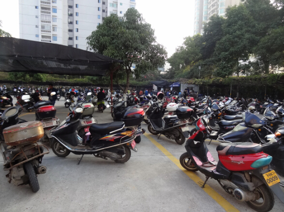 2014年12月31日,在長洲區(qū)中環(huán)大酒店停車場燃油助力車登記工作點,等候申請辦理臨時通行標(biāo)識的車輛停滿了整個停車場。 黃東榮 攝
