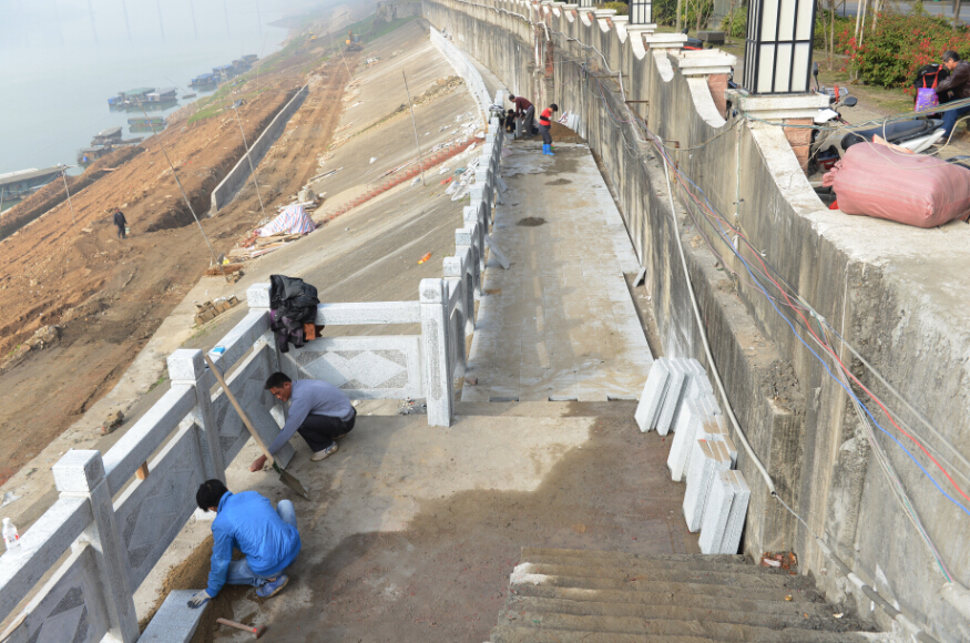 2014年12月30日,在西堤公園外,工人正在進(jìn)行堤外人行道施工。 據(jù)了解,近段時間天氣晴好,西江汊河橋至角嘴段岸坡景觀提升工程(一期)也抓緊施工,全力加快進(jìn)度。目前,最上級的人行道已經(jīng)修建欄桿、鋪設(shè)地面400多米,第二級人行道以及部分緩坡正在加快路面平整。 李鴻榮 攝