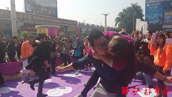 1月2日,梧州商家舉辦接吻大賽,參賽者在現(xiàn)場表演各種接吻姿勢。陳素雅/攝