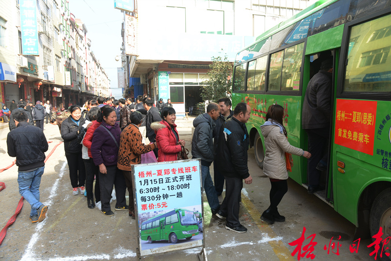 1月15日,在萬秀區夏郢鎮鎮區,乘客有序登上客運專線車。 當天,梧州至夏郢(思委)公交化客運專線正式開通。據介紹,該專線由梧州超大金暉汽車運輸有限公司營運,共投入13輛客車,設金暉客運站至夏郢鎮和思委兩條線路,全程行駛約一個小時,營運時間為每日6時30分至18時。