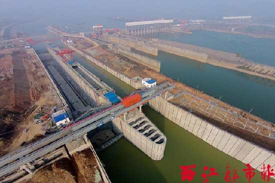 ????據工作人員介紹,三線和四線船閘的最大通過船舶噸級為3000噸級,船閘有效尺寸為340米×34米×5.8米(長×寬×門檻水深),閘室一次可容納15至18艘3000噸級貨船待航通過。