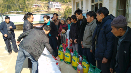 ??? 梧州市衛生計生委的工作人員為華映村的困難群眾送上慰問品。陳素雅/攝