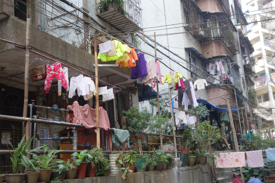 在石鼓沖一居民樓外,居民把自己的衣服晾曬在屋外的電纜上,安全隱患突出。???