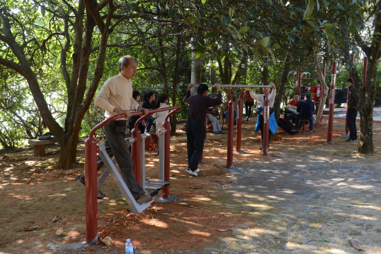 1月22,在白云山公園山頂,人們正使用健身設施鍛煉身體。前段時間,市體育部門和白云山公園管理處在公園內增辟健身區域,增加了單杠、健身車、太極揉推器等十多套健身設施。 李鴻榮 攝