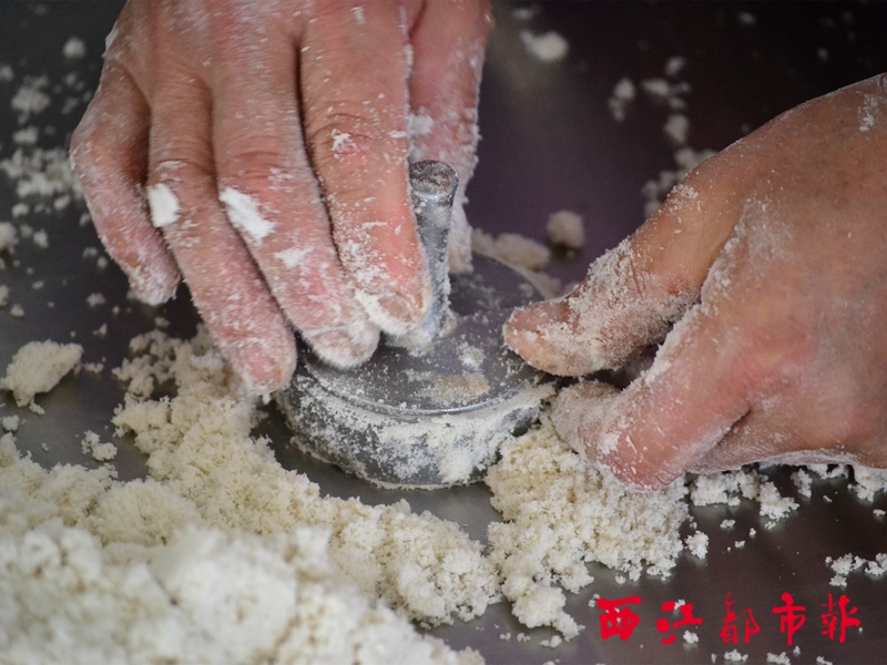 ????制太平米餅并不簡單,需要做好炒米、打粉、制餅、蒸餅等幾個步驟。炒米是在一個大鐵鍋中將糯米、高粱炒熟,待其出現膨松感,外黃里香后鏟出,再用碾米機或石磨將其碾成粉,然后攤在地上晾幾天,讓米粉有潤濕感,俗稱“吸地氣”。