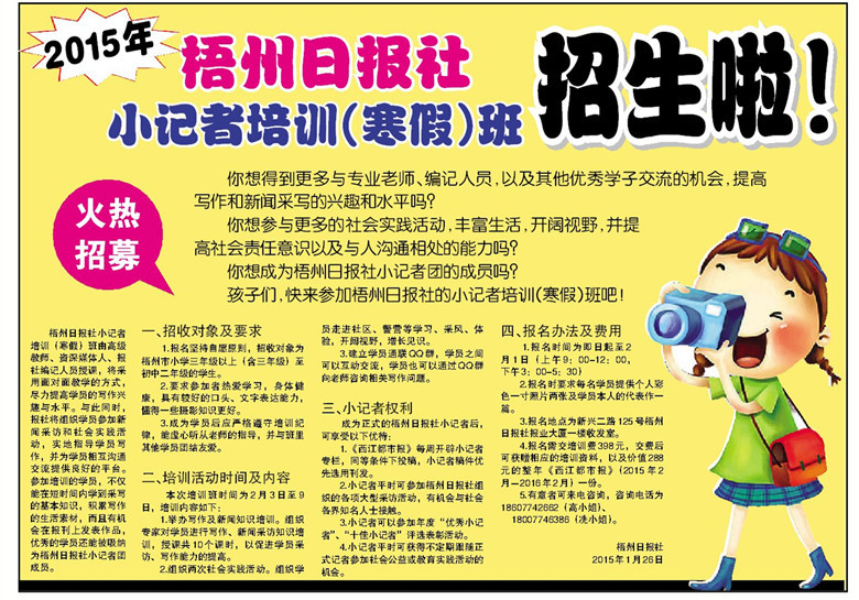 ??? 西江都市報(bào)訊 (記者 高云)昨日,“2015年梧州日?qǐng)?bào)社小記者培訓(xùn)(寒假)班”正式接受報(bào)名,陸續(xù)有家長(zhǎng)撥通熱線電話進(jìn)行咨詢。不少家長(zhǎng)表示,小記者培訓(xùn)班合理的課時(shí)安排,走進(jìn)社區(qū)、走進(jìn)警營(yíng)等社會(huì)實(shí)踐課程的設(shè)置,不僅可以讓孩子學(xué)習(xí)到新聞寫(xiě)作的知識(shí),也能充實(shí)孩子的寒假生活。