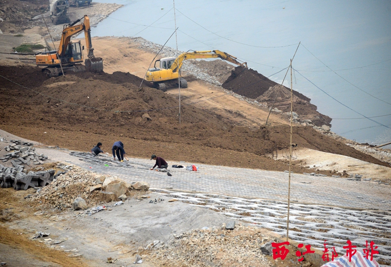 ?1月27日,施工人員在灝景尚都對出的西江江岸上鋪設(shè)護岸邊坡的地磚。目前,河西防洪堤堤外護岸景觀工程正抓緊建設(shè),施工單位抓緊枯水期的有利施工季節(jié)邊平整邊坡,邊鋪設(shè)地磚,工程建設(shè)有序推進。 本報記者 蒙紹松/攝