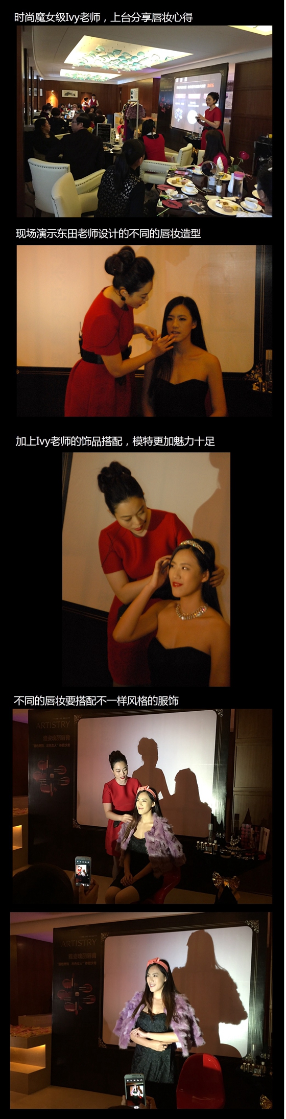 ??? 活動中,時尚達人Ivy老師巧用雅姿瑰麗唇膏在現(xiàn)場演繹“中國彩妝大師”李東田設(shè)計的5款唇妝造型,演示了5款顏色分別于不同的飾品,于不同的情境下的使用方法,解開了口紅顏色與全身搭配的秘密。讓大家都學到口紅與飾品的完美搭配,為自己的美麗加分。