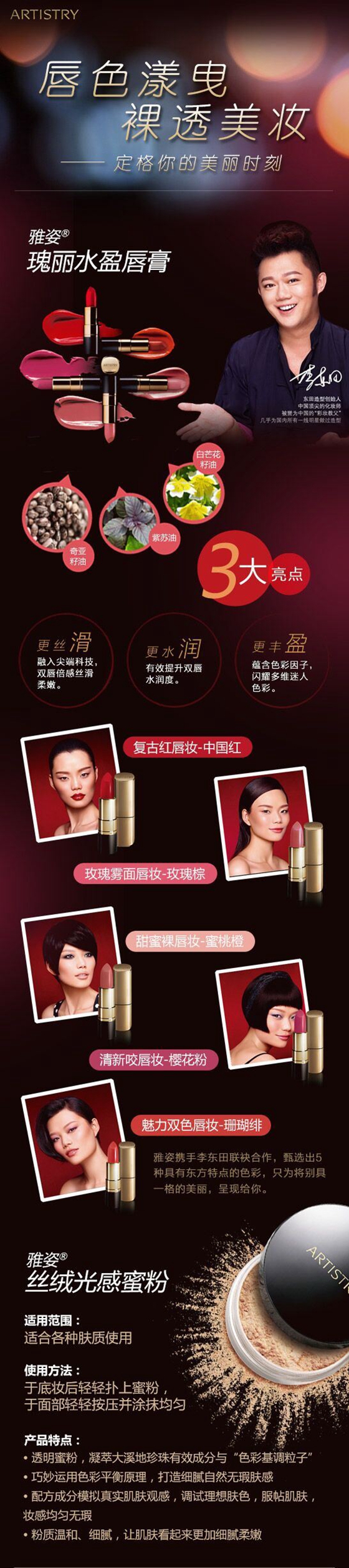 ???? 雅姿攜手李東田甄選5款最適合東方女性的顏色:復古中國紅、柔情玫瑰粽、陽光蜜桃橙、浪漫櫻花粉、高貴珊瑚緋,皆能適合不同心情與場合,滿足不同妝容需求,令你佇立于人群中時,怒刷存在感;輕舞于妝色盛宴中時,成為最具風情的主角!