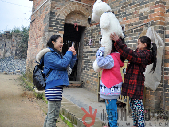 程家姐妹穿上愛心人士捐贈的冬衣,抱著收到的公仔,開心地玩耍。愛心市民李小姐給她們拍照。