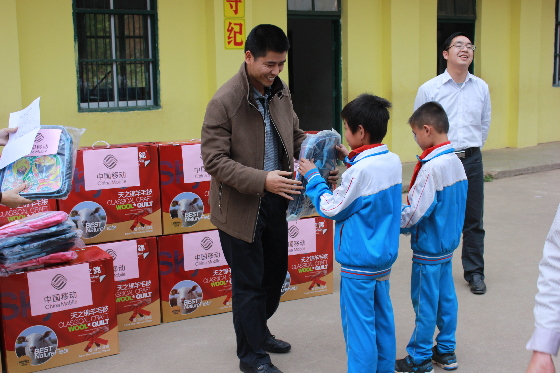梧州移動愛心小分隊將書包、文具、羊毛被等物資一一分發到每位孩子的手中
