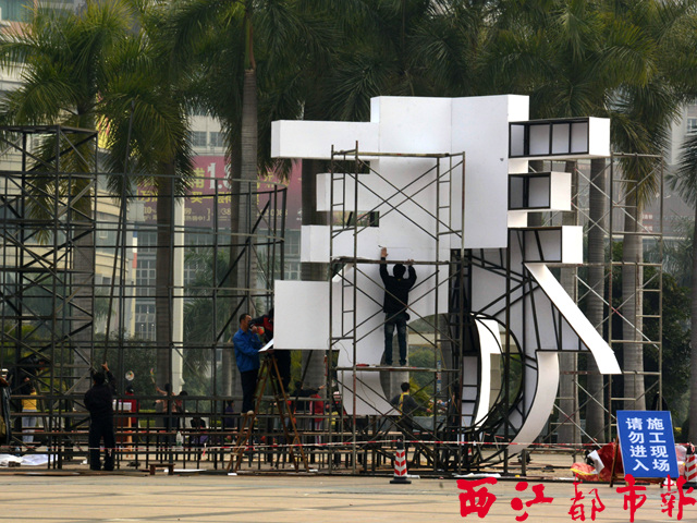 ????2015年2月6日上午,在市政廣場,工人們正在密鑼緊鼓布置羊年新春的景觀造型,讓市民過上一個喜氣洋洋的羊年春節。 呂其雪/攝