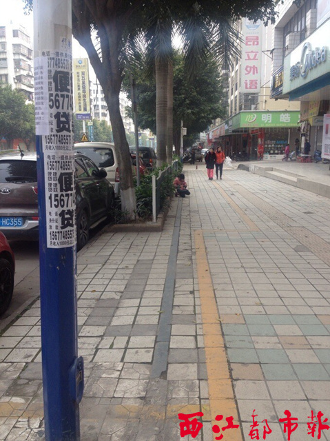 在新興二路,幾張貸款廣告張貼在路邊廣告支架上。類似現象在市內不少街道隨處可見。萬立平/攝