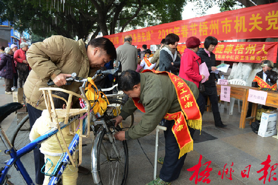 2月7日上午,在鴛江麗港廣場,社區(qū)黨員義工為群眾修理自行車。 李鴻榮 攝