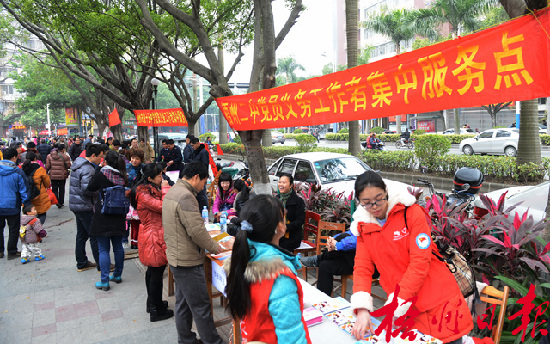 ????梧州日報訊(記者 梁燕如 實(shí)習(xí)生 曾韻) 2月7日上午,“黨員義工連萬家,為民服務(wù)當(dāng)先鋒”全市機(jī)關(guān)黨員義工春節(jié)集中為民服務(wù)活動在鴛江麗港廣場、新興二路大塘市場至清華苑人行道、龍圩中心廣場和市人才市場同時舉行。來自全市23個機(jī)關(guān)黨工委,各城區(qū)及市直部門單位,以及中直、區(qū)直駐梧單位部門的1200多名黨員義工走上街頭,以一系列貼近生活、務(wù)實(shí)為民的服務(wù)行動贏得了市民稱贊。