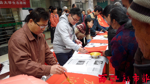??? 近日,由藤縣有關(guān)部門和藤縣大學(xué)生志愿團(tuán)聯(lián)合主辦的義贈(zèng)春聯(lián)活動(dòng),在藤縣各鄉(xiāng)鎮(zhèn)巡回服務(wù)當(dāng)?shù)卮迕瘛?通訊員 劉陳欣/攝