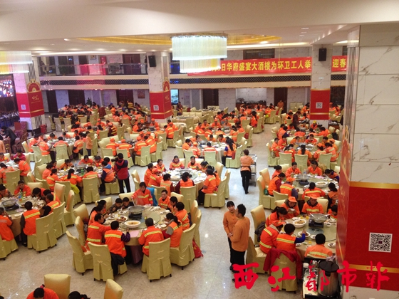 ????為了在春節來臨之際,讓環衛工人享受一頓豐盛的晚宴。當天晚上,華府盛宴大酒樓為470多名環衛工人舉行迎春晚宴,慰勞他們一年多來為維護梧州城市美麗而付出的艱辛。