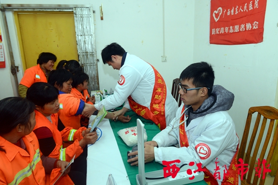 2月9日,醫護人員在長洲區環衛站為環衛工人義務檢查身體。當天,由桂東人民醫院、紅會醫院等青年志愿者組成的醫療分隊,來到長洲區環衛站進行“關愛健康 與愛同行”之情暖環衛工人的義診活動。 本報記者 蒙紹松/攝