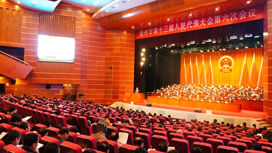 ??? 梧州零距離網訊 (記者 黃祎婧 見習記者 許愿)2月11日上午,為期兩天的梧州市第十三屆人民代表大會第六次會議在市文化展覽中心開幕,325名人大代表出席會議。市長朱學慶代表梧州市政府向大會作政府工作報告。