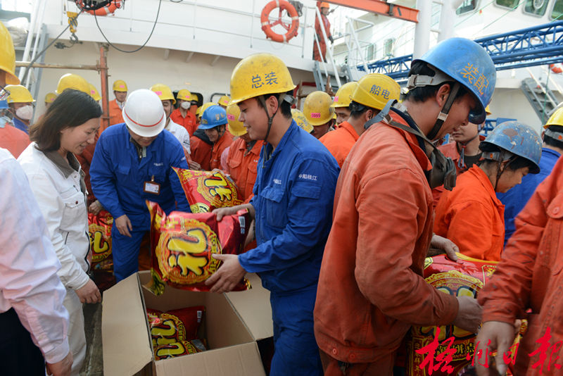 2月16日,在中船桂江造船有限公司造船車間,工人們領取年貨禮包。當天,市總工會到中船桂江造船有限公司慰問外來務工人員,向工人們送上年貨禮包和新春祝福。據(jù)介紹,由于目前訂單充足,桂江造船公司已安排大年初四開始恢復正常生產。 李煜榮 攝