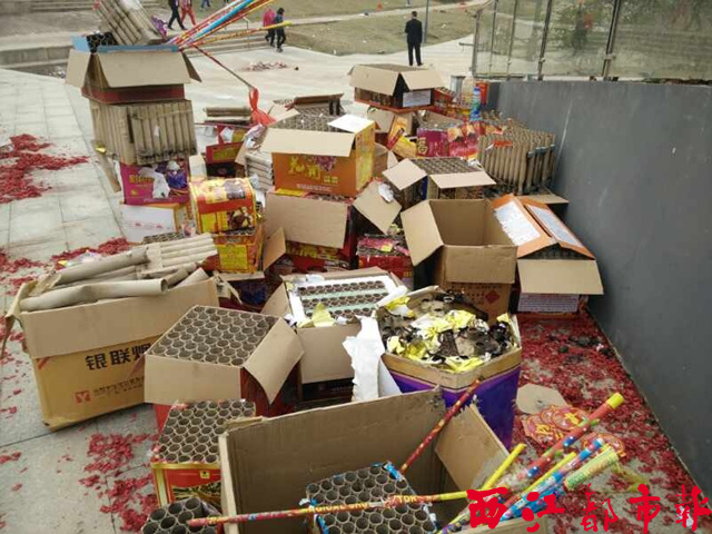 ????2月19日是羊年大年初一,在這本該值得高興的日子里,玫瑰湖公園的保潔員卻一點都樂不起來——因為公園里到處都是市民、游客燃放煙花爆竹后產(chǎn)生的碎屑和垃圾。公園內(nèi)的兩個小廣場,由于較為空曠,更是成了“重災區(qū)”,紅紅火火的煙花爆竹碎屑散落一地,旁邊還堆起了大大小小的煙花爆竹包裝盒(下圖)。