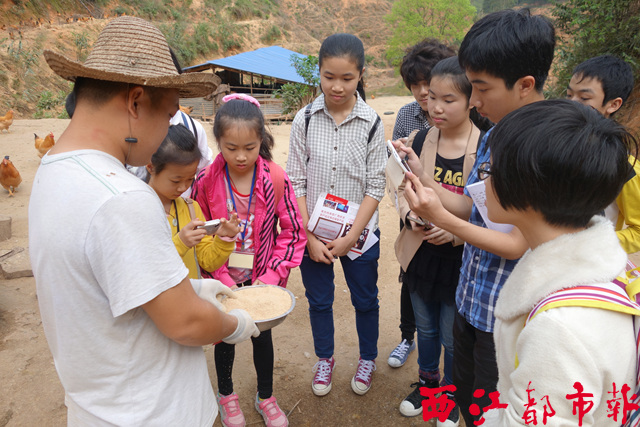 ????2月27日, 2015年梧州日報社小記者培訓(寒假)班的部分學員來到新粵西樓紙包雞專用三黃雞養殖示范基地,及其特色餐廳采訪。采訪中,小記者們運用在培訓班課堂上所學的知識,努力“還原”這款“廣西手信”的成長記和展望梧州美食文化的未來。