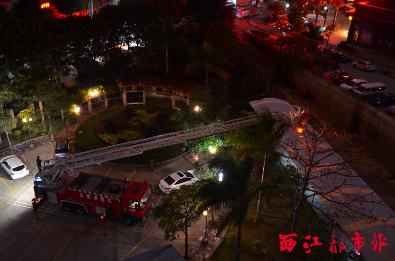 2月28日晚8時,梧州市公安消防支隊的幾名消防官兵,在梧州日報社大院內使用云梯消防車摘除樹上的馬蜂窩。