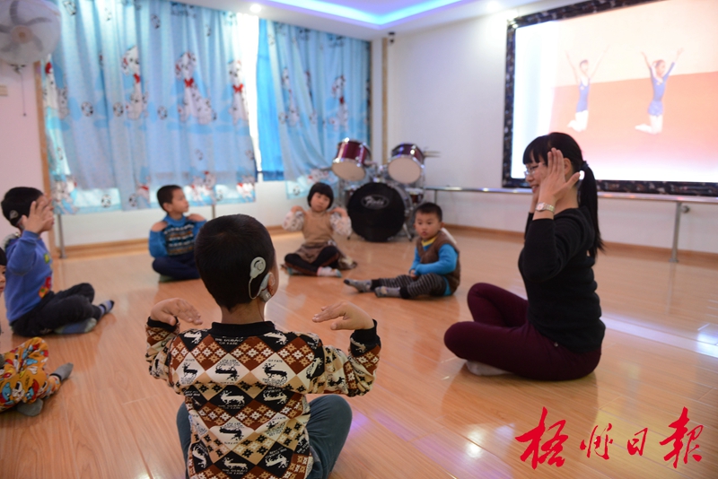??? 3月3日,在梧州市聾兒語訓中心多感覺律動教室,聽障兒童正在伴著節奏,跟隨老師學習有關動作。