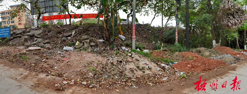 在轉入萬秀區夏郢鎮的道路路口,綠地成了垃圾場,堆滿生活、建筑垃圾。孟亞西 攝
