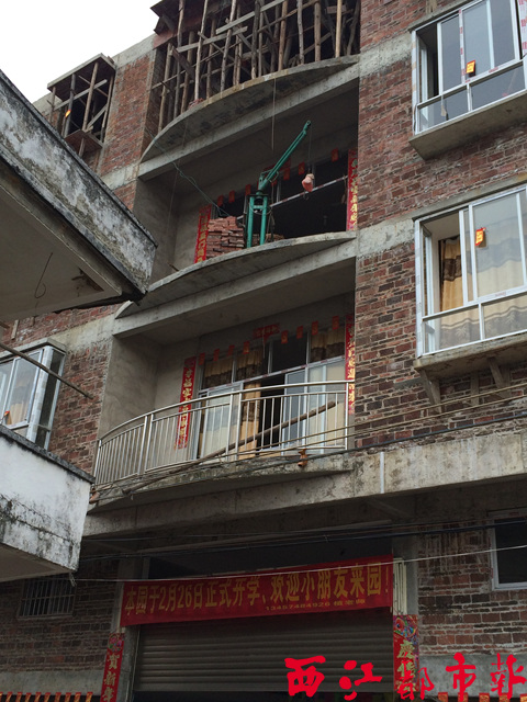 ????3月1日,長洲區教育局和倒水派出所組成聯合執法組前往倒水鎮富萬村進行調查取證。當執法組來到這家幼兒園時,幼兒園的老師和兒童正在上課,而上課的環境則讓執法人員驚出一身冷汗。這棟四層高的私人樓房仍在施工建設中,三樓陽臺連護欄都沒有,還堆疊著大量磚頭和鉤機,而四樓則剛搗制樓頂,且沒有安全網隔離,磚木隨時有可能掉落,存在嚴重安全隱患。