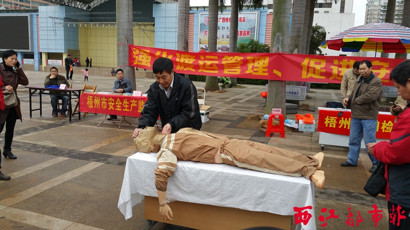 ????活動中,各部門積極通過宣傳圖片展覽、發放宣傳資料、現場解答問題等方式,向社會公眾提供渡運安全政策法規咨詢與服務。此外,梧州海事局還邀請梧州市交通職業技術學校的專業老師,現場演示了溺水后人工呼吸與心肺復蘇的急救動作要領。