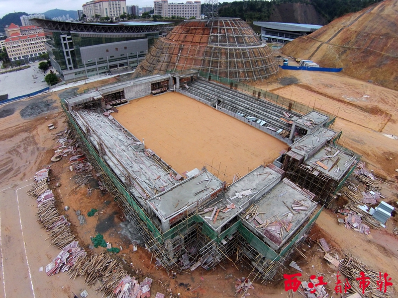 ??? 3月12日,在空中俯瞰建設當中的梧州市網球中心。目前,網球中心建設項目已基本完成室外排水管網及中心球場主體建筑部分。