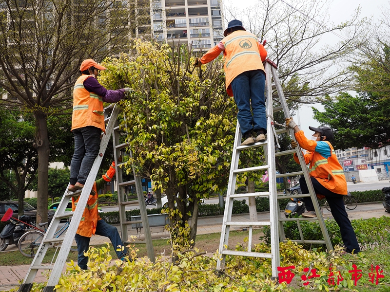 ?3月14日,梧州市園林綠化工程處的員工正對西堤路的綠化帶進行春季大修剪。據介紹,通過對花卉樹木修剪,以及加強肥水的管理,在開春之時,能更好地促進植物開枝發芽和生長開花。 本報記者 陳健新 攝影