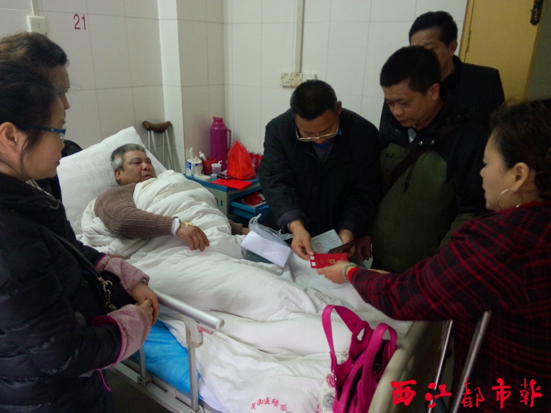 日前,梧州市肢殘協會的成員和熱心市民探望住院的陳就恒。 本報記者 黃穎盈 攝